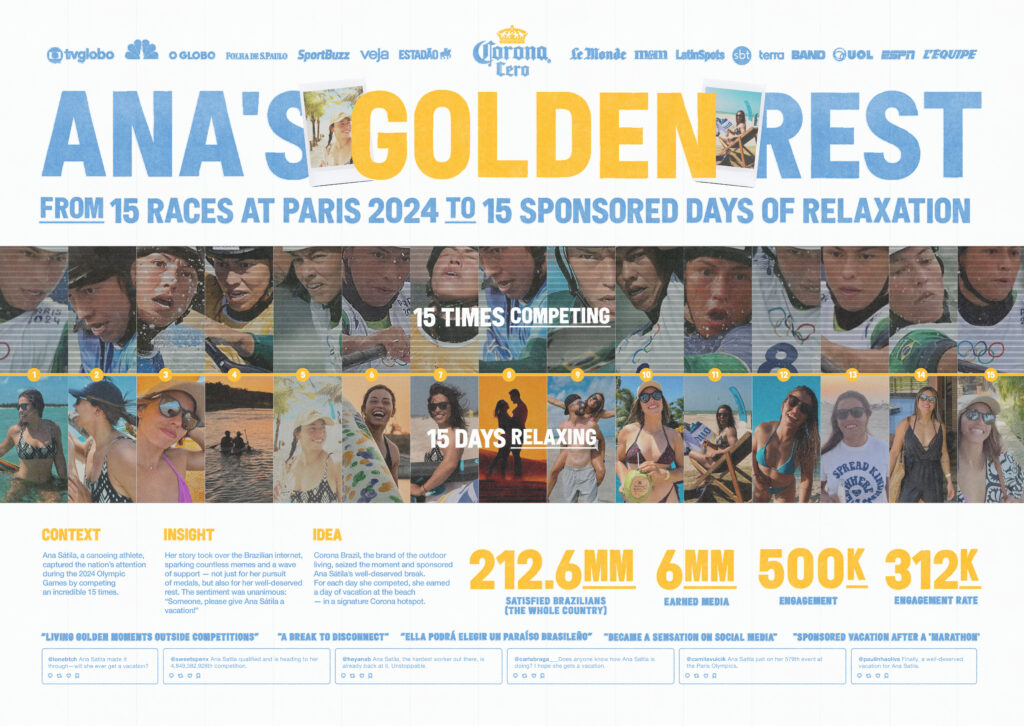 The Olympics are the peak of human performance — and Ana Sátila proved it by competing 15 times. But even the strongest athletes need a break, right? That’s why Corona, the first beer to sponsor the Olympics, also became the first to sponsor the rest of the world’s most competitive athlete.